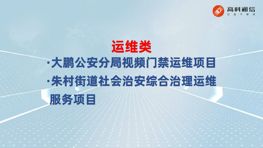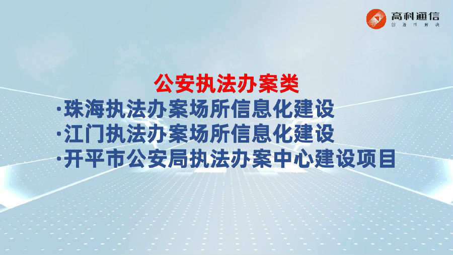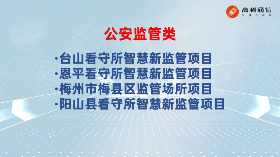 公司簡介廣州市高科通信技術股份有限公司成立于1993年,公司圍繞智慧城市、通信接入兩大業務板塊,集自主研發、解決方案設計、生產制造、銷售服務于一體,致力為政府信息化部門、政法委、公檢法等相關部門以及國內三大運營商、國外運營商提供頂層規劃設計、方案解決和定制服務。在智慧城市領域,高科承建了300多個項目,全面覆蓋公共安全、平安城市、雪亮工程、智慧交通、信創、部隊、教育、金融等。近年來,公司深耕公安智慧新監管建設,推出智慧新監管全要素全流程數字化解決方案,全面賦能公安監管一體化應用與實戰業務支撐。高科通信始終秉承“責任、抱負、激情”核心價值觀,肩負成為“第一公里接入專家及智慧創新及應用專家”使命,不斷推進5G、人工智能、大數據、智能感知等核心技術的產業落地應用,堅持“創造性解決”的理念,攜手合作伙伴共創數字生態!